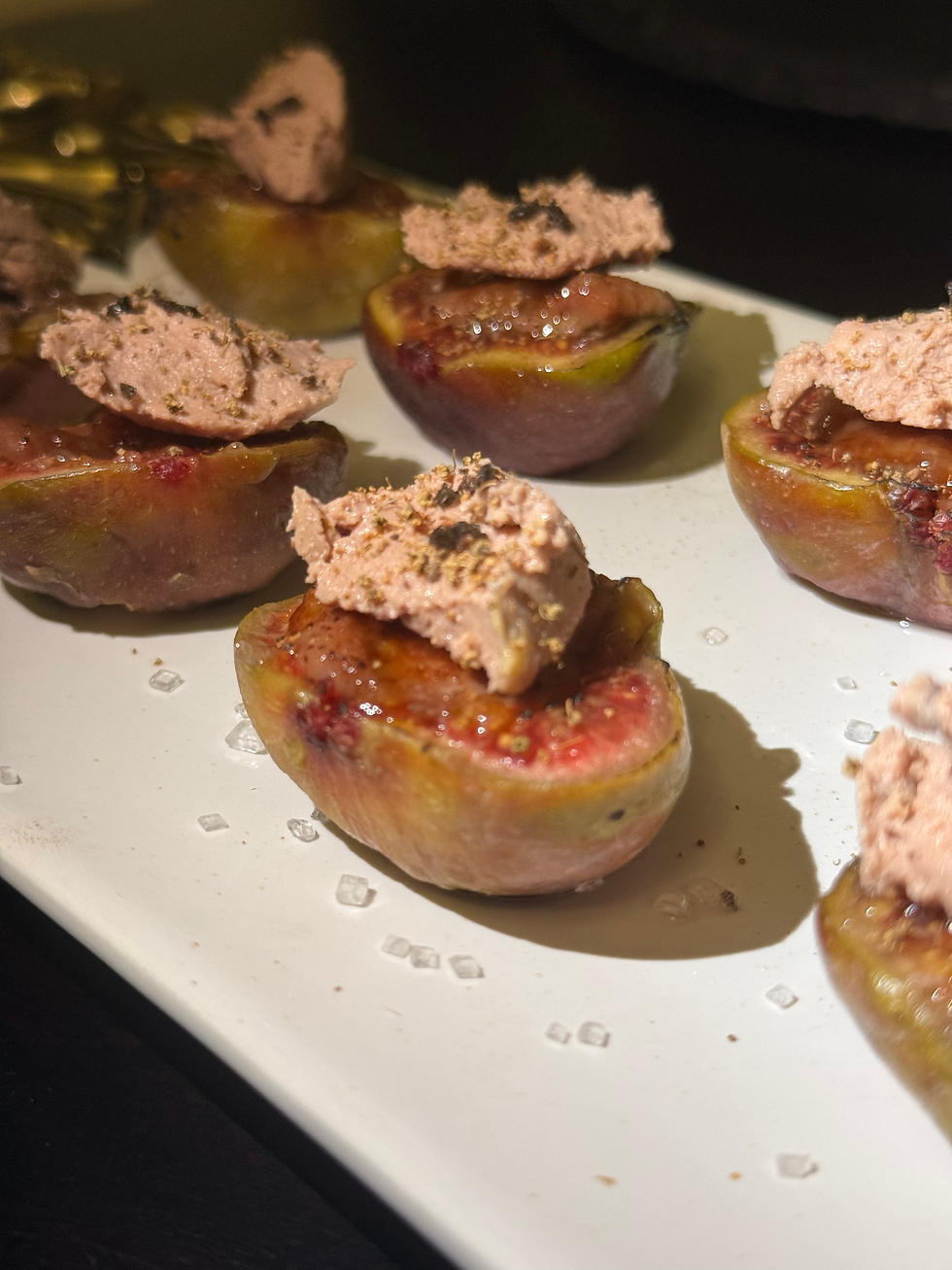 I loved this combination of figs and foie. Last year, I was travelling in Krakow, Hungary, and I found this little shop at the farmers' market that specialised in charcuterie. I was stocking up on Bresaola and smoked venison sausages when I spied these small cans of foie gras, goose liver pate, in the corner. I had to pick up a few. The owner explained that these were special cans infused with their spectacular Tokai sweet wine. The pairing is lovely, with the wine's sweetness accentuating the foie's earthiness beautifully. I only open these for special occasions, and a few nights I had a dinner for some close friends and felt the urge to open a can.