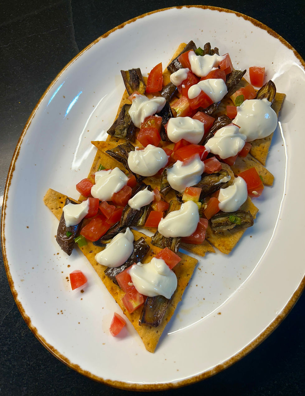 When you're ready to serve, layer the pita chips on a platter. Add pieces of the eggplant alternated with the tomatoes. Top with blobs of yoghurt sauce. Serve immediately before the pita chips get soggy.